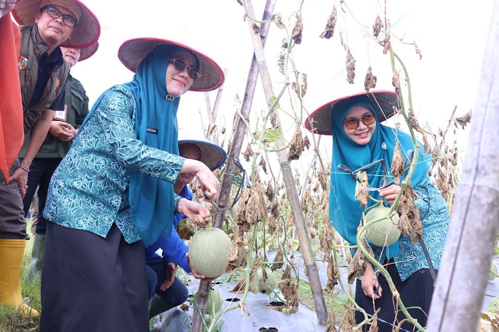 Ketua TP PKK Sulastri dan Wakil Ketua TP PKK Pekanbaru dr.Sari Rahmawati melakukan panen melon.